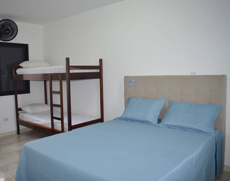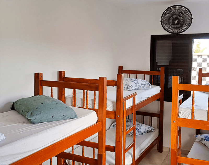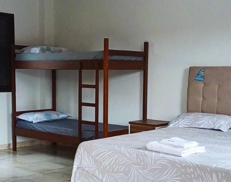 Quarto quádruplo com uma cama de casal queen e um beliche, dispõe de ar-condicionado, TV de tela plana, frigobar, enxoval completo e banheiro privativo.